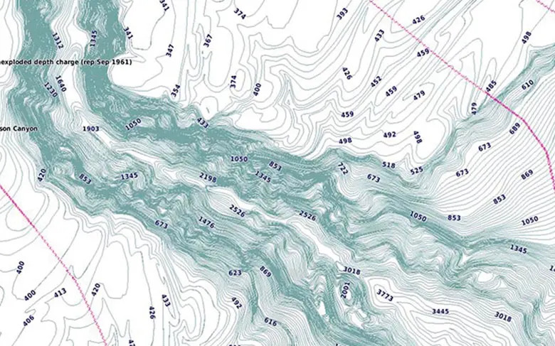 Pour aider à la navigation, la fonction ombrage des hauts-fonds permet de personnaliser l’affichage de la cartographie en indiquant les zones de hauts-fonds à éviter.